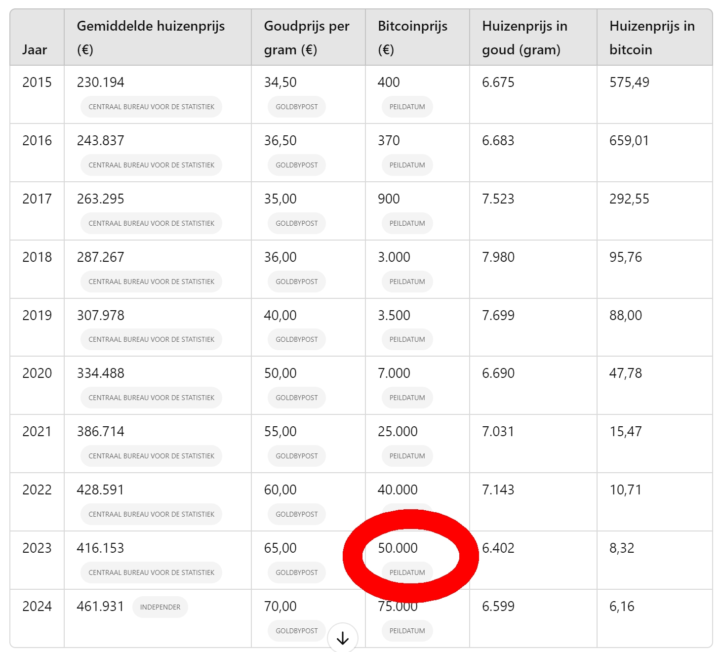 Laten we ons even focussen op 2023 waar volgens jouw plaatje de prijs van bitcoin €50.000 is.