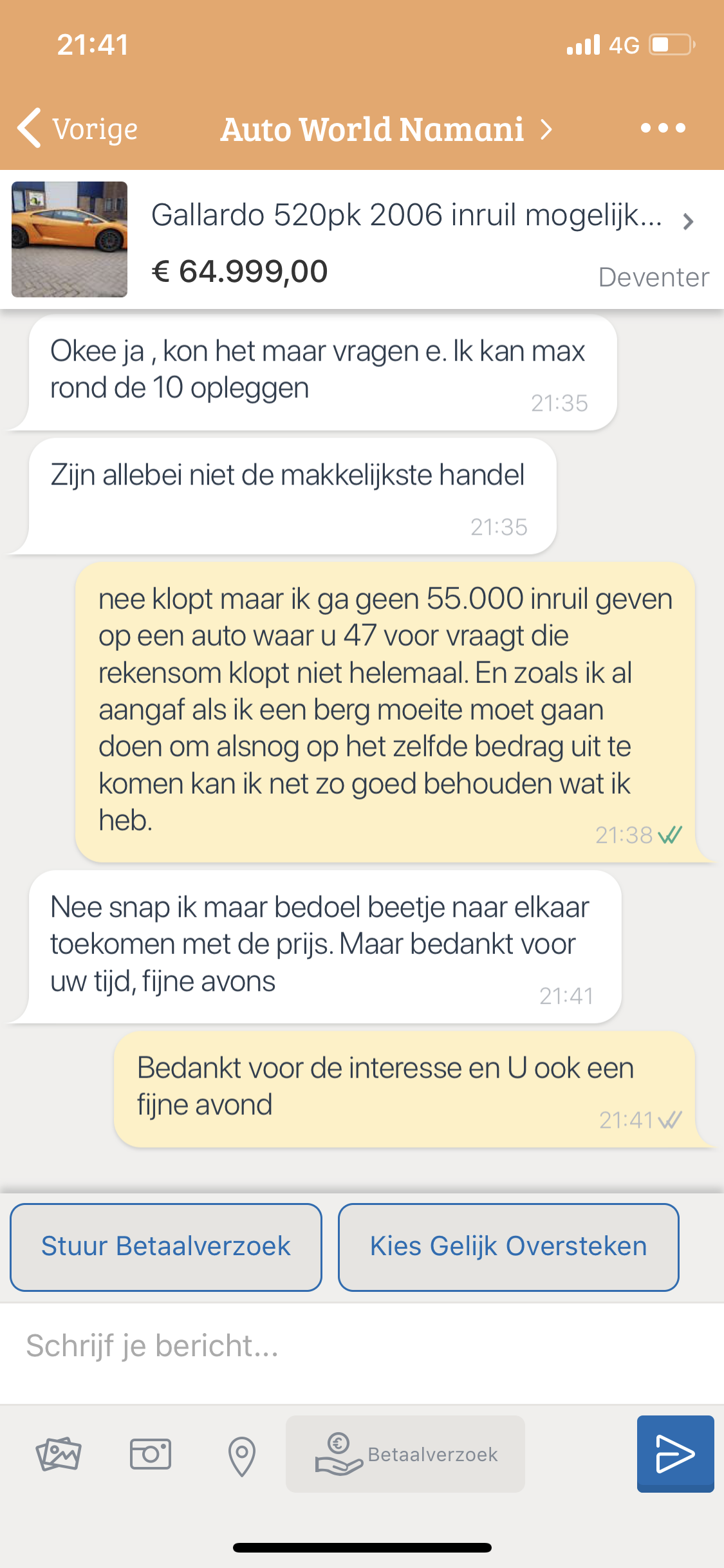 Ik heb er iets op staan voor een bepaalde prijs, krijg ik een berichtje, "wat is je minimale prijs?" Dus vraag ik terug, "wat wil je maximaal geven?" En nu blijft het al een paar dagen stil.