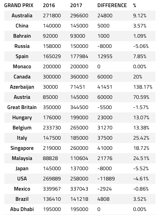 Bezoekersaantallen van andere circuits, per weekend van 2016 en 2017. Ik weet niet of Zandvoort dan uitkomt met 60000 per dag.